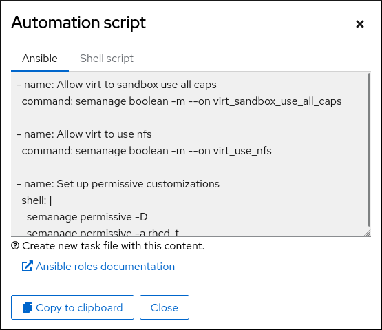 在 Web 控制台中,您可以生成一个 shell 脚本或一个 SELinux 配置的 Ansible playbook。如果是 Ansible playbook,您可以在多个系统上方便地应用配置。