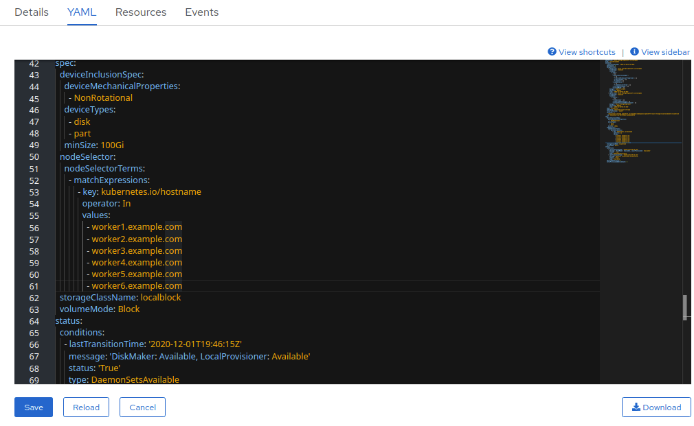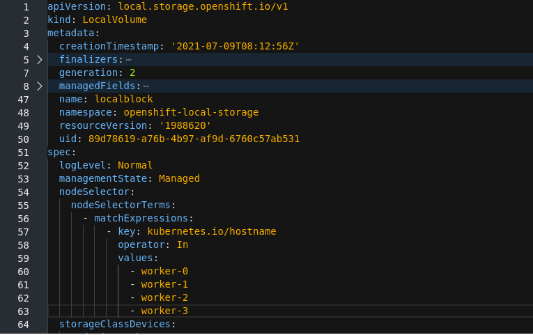 自定义资源(CR)中添加额外的磁盘。oc edit -n openshift-local-storage localvolume localblock