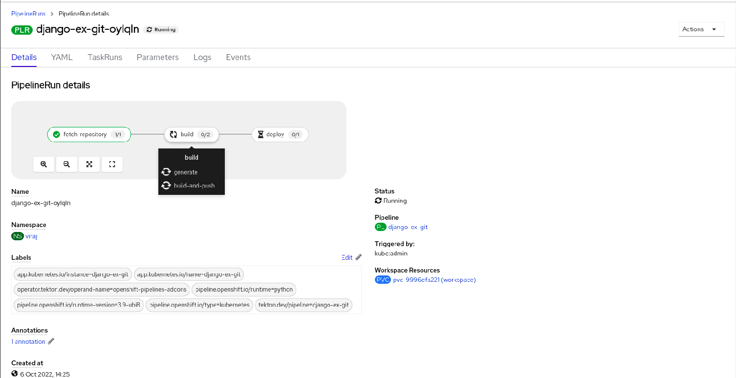 - 使用 PipelineRun 详情页面的左下角,使用 zoom in、zoom out、适用于屏幕和重置视图功能,它们位于 PipelineRun 详情页面的左下角。