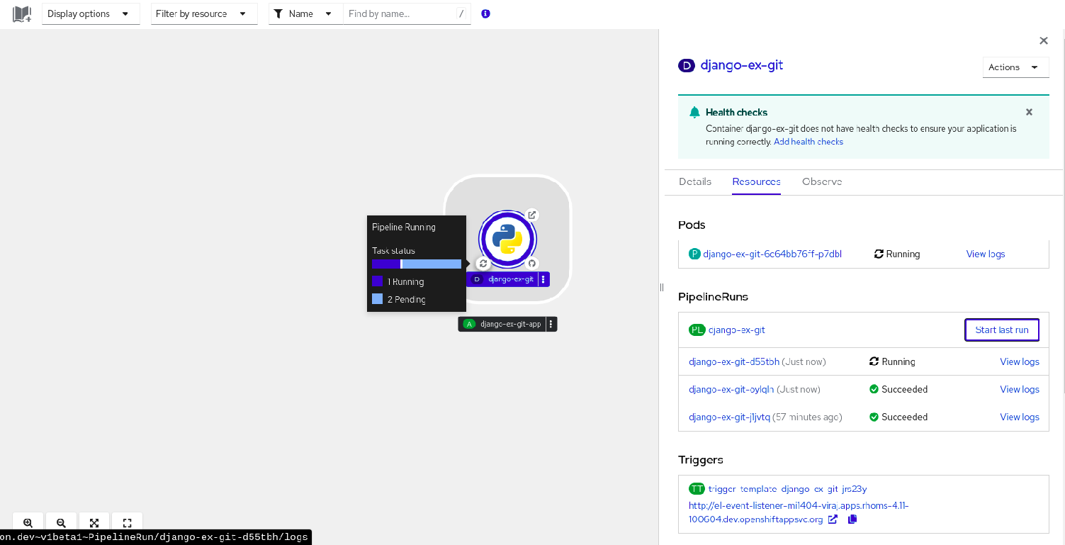 在 Topology 页面中,把鼠标移到应用程序的左侧,以查看其管道运行的状态。添加管道后,底部左图标表示存在关联的管道。