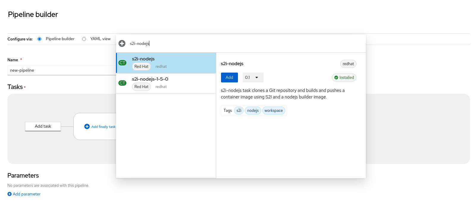 点击 Add 或 Install and add。在本例中,使用 s2i-nodejs 任务。