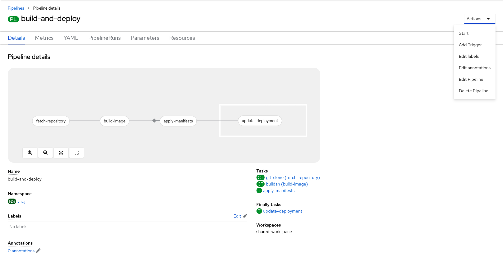 创建管道后,您需要启动它以在定义的顺序中执行包含的任务。您可从 Pipelines 视图、Pipeline Details 页面或 Topology 视图启动管道。