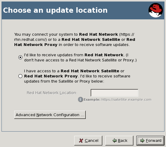 「选择更新位置」页面可让您选择您的软件更新资源 -- 可以是 RHN 主机托管,或者 RHN Satellite 服务器或者 Proxy 服务器。对于 Satellite 或者 Proxy,按关联的单选按钮并在「红帽网络位置」字段输入您的 Satellite 或者 Proxy 的 URL。