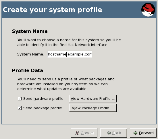 「生成您的系统侧写」页面可让您为想要注册系统选择的侧写名称。默认是系统的主机名,但您可以将其改为您喜欢的名称。您还可以选择是否要向 RHN 包括硬件和软件包信息。建议您选择要报告此信息,这样可允许 RHN 自动在基本频道和最适合您系统的子频道中订阅您的系统。如果您想要,您还可以按 或者 按钮查看